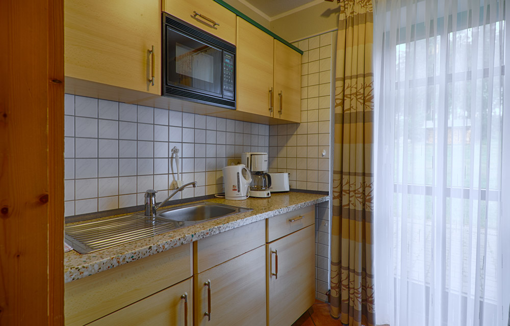 ✓ 1 moderne Küche mit Ceranherd, Mikrowelle, Toaster, Kaffee-„Pad“-maschine und Wasserkocher